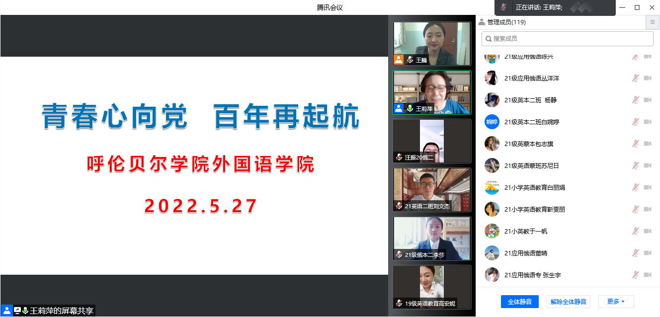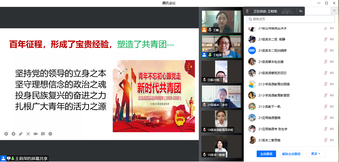 按照共青团中央《关于深入学习宣传贯彻习近平总书记在庆祝中国共产主义青年团成立100周年大会上重要讲话精神的通知》要求,为深入领会习近平总书记重要讲话的重大意义和深刻内涵,扎实推动习近平总书记重要讲话精神学习宣传在全团和广大青少年中深入开展,5月27日,bw西汉姆联邀请北京青年政治公司王莉萍教授为全院师生带来“青春心向党 百年再启航”主题线上讲座,bw西汉姆联入党积极分子、员工会全体成员130余人参加了讲座,讲座由bw西汉姆联团总支书记王巍主持。