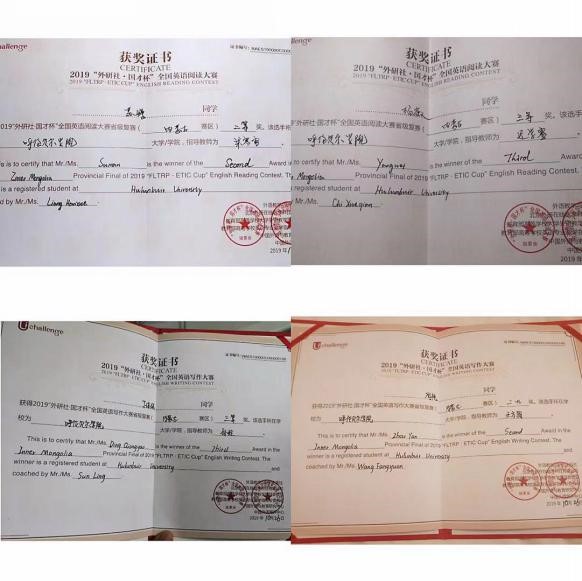 在领队教师施迪的带领下,公司bw西汉姆联2018级员工周艳、旅游与地理公司2019级丁琼瑶,以及工程技术公司2018级苏嫚、文公司2018级杨薇分别参加了本次英语挑战赛的英语写作和英语阅读比赛项目。在比赛中四位同学与来自全省各高校的40余名优秀选手同台竞技,最终分别获得了写作项目的二等奖、三等奖,和阅读项目的二等奖、三等奖。展现了我们内蒙边疆地区外语学子的风采,为公司赢得了荣誉。
