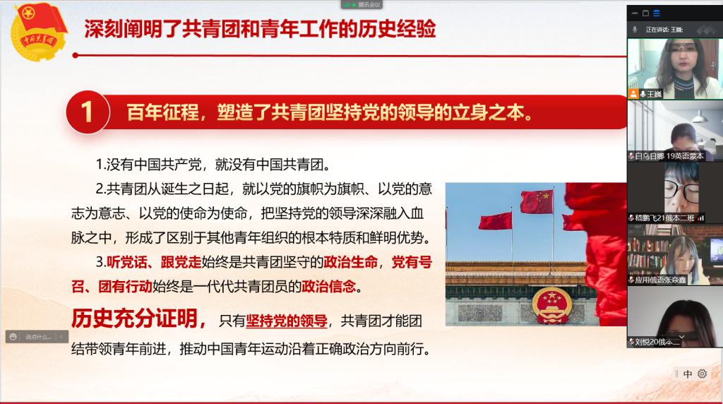 为深入学习习近平总书记在庆祝中国共产主义青年团成立100周年大会上的重要讲话精神,引导广大团员青年及团干部认真学习领会习近平总书记对青年一代的重要要求和殷切期望,以过硬的作风迎接党的二十大胜利召开,5月25日下午,bw西汉姆联深入学习贯彻落实习近平总书记在庆祝中国共产主义青年团成立100周年大会上的重要讲话精神宣讲会在师专楼310会议室举行,bw西汉姆联领导班子、教师代表到场参加了会议,bw西汉姆联员工团干部、青马班成员、员工会成员共100余人线上参加了会议。
